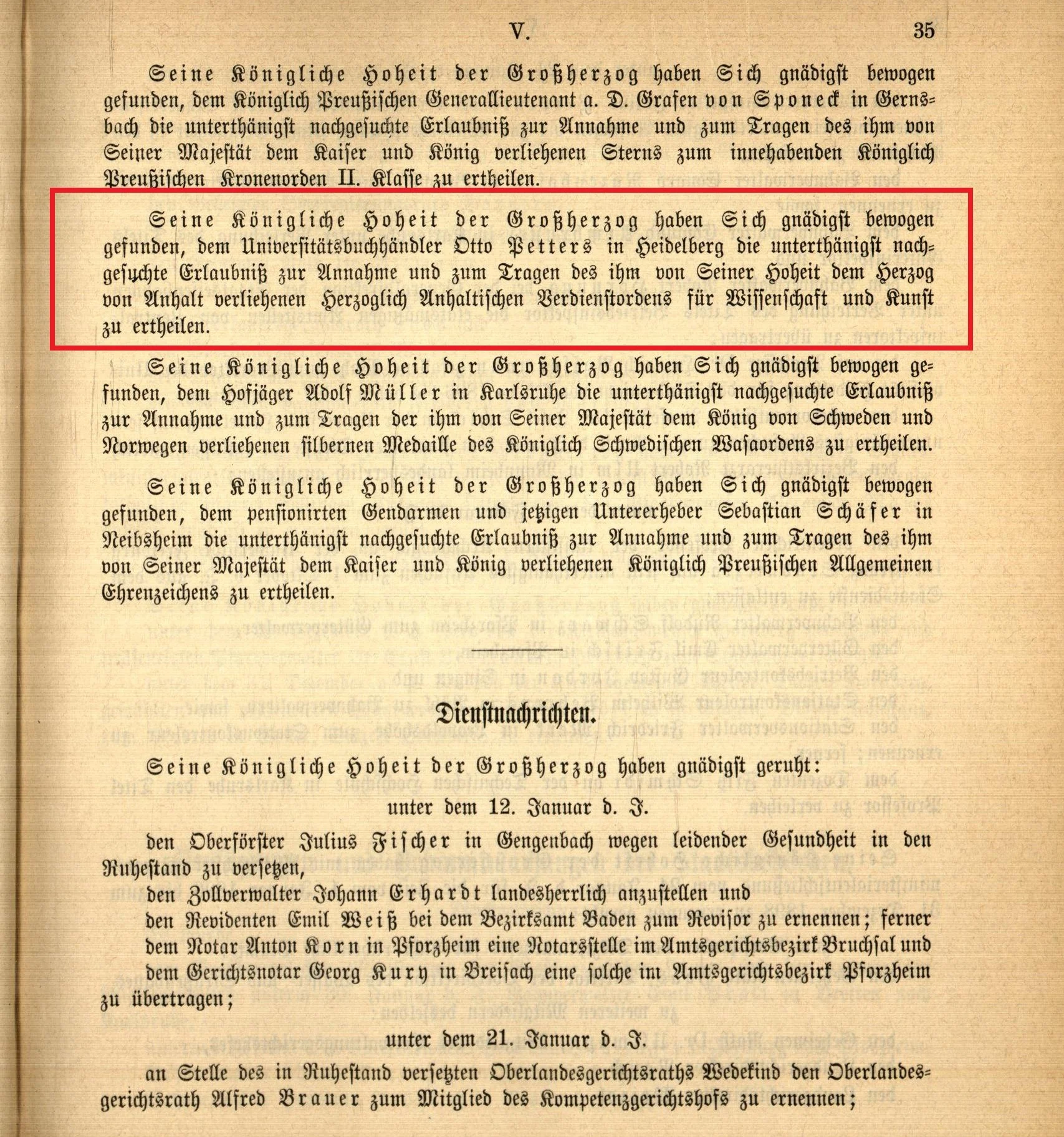 Engagierte Anteilnahme am gesellschaftlichen Leben ging natürlich an den Protagonisten nicht „auszeichnungslos“ vorüber. Für seine verlegerische Tätigkeit verlieh der Herzog von Anhalt seinem Landeskind Otto Petters am 11.12.1895 den Verdienstorden für Wissenschaft und Kunst. Seinen aktuellen Landesherrn, den Großherzog von Baden bat Petters pflichtgemäß um Genehmigung der Annahme, die ihm am 14.02.1896 auch erteilt wurde.